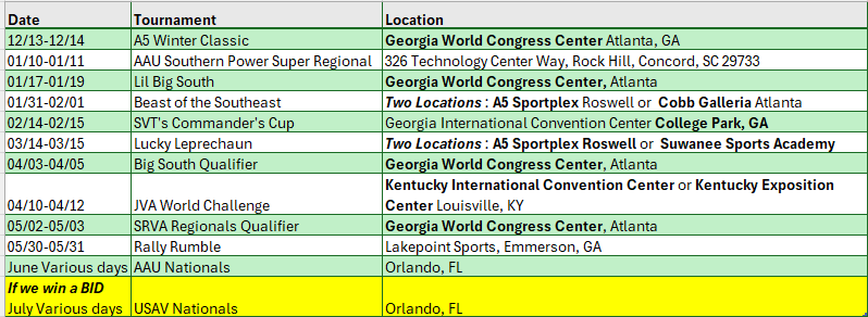 Tournament Types: Most tournaments are 2 days, but some are 3–4 days of nonstop volleyball action! You’ll compete against tougher teams, play in national qualifiers, and even travel out of state for exciting challenges.